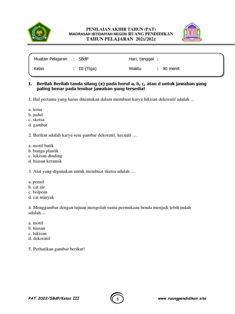 Penilaian Akhir Tahun (PAT) merupakan evaluasi akhir yang penting bagi siswa kelas 3 semester 2. Mata pelajaran Seni Budaya dan Prakarya (SBDP) pada jenjang pendidikan dasar menekankan pada pengembangan kreativitas, kemampuan bereksplorasi, dan apresiasi terhadap karya seni. PAT SBDP kelas 3 semester 2 bertujuan untuk mengukur sejauh mana siswa telah mencapai kompetensi dasar yang telah ditetapkan dalam kurikulum. Soal-soal yang diberikan dirancang untuk menguji pemahaman siswa terhadap materi yang telah dipelajari selama satu semester, mencakup menggambar, mewarnai, dan menghias. Penguasaan materi ini penting untuk menumbuhkan rasa estetika dan kreativitas siswa sejak dini.