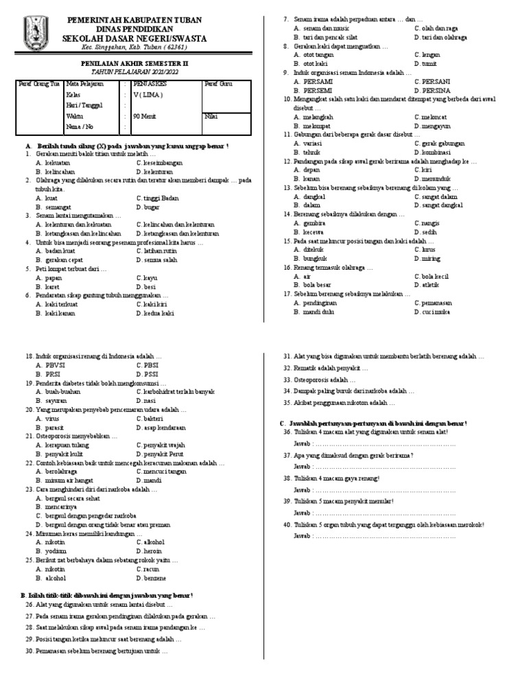 Penilaian Akhir Semester (PAS) merupakan evaluasi penting bagi siswa kelas 5 dalam mata pelajaran Penjaskes (PJOK). Semester 2 umumnya mencakup materi yang lebih kompleks dan terintegrasi dibandingkan semester sebelumnya. Oleh karena itu, persiapan yang matang sangat diperlukan untuk meraih hasil yang optimal. Artikel ini akan membahas secara rinci materi-materi yang mungkin diujikan dalam PAS PJOK kelas 5 semester 2, disertai dengan contoh soal dan pembahasannya. Tujuannya adalah untuk membantu siswa dalam memahami materi dan meningkatkan kemampuan mereka dalam menghadapi ujian.